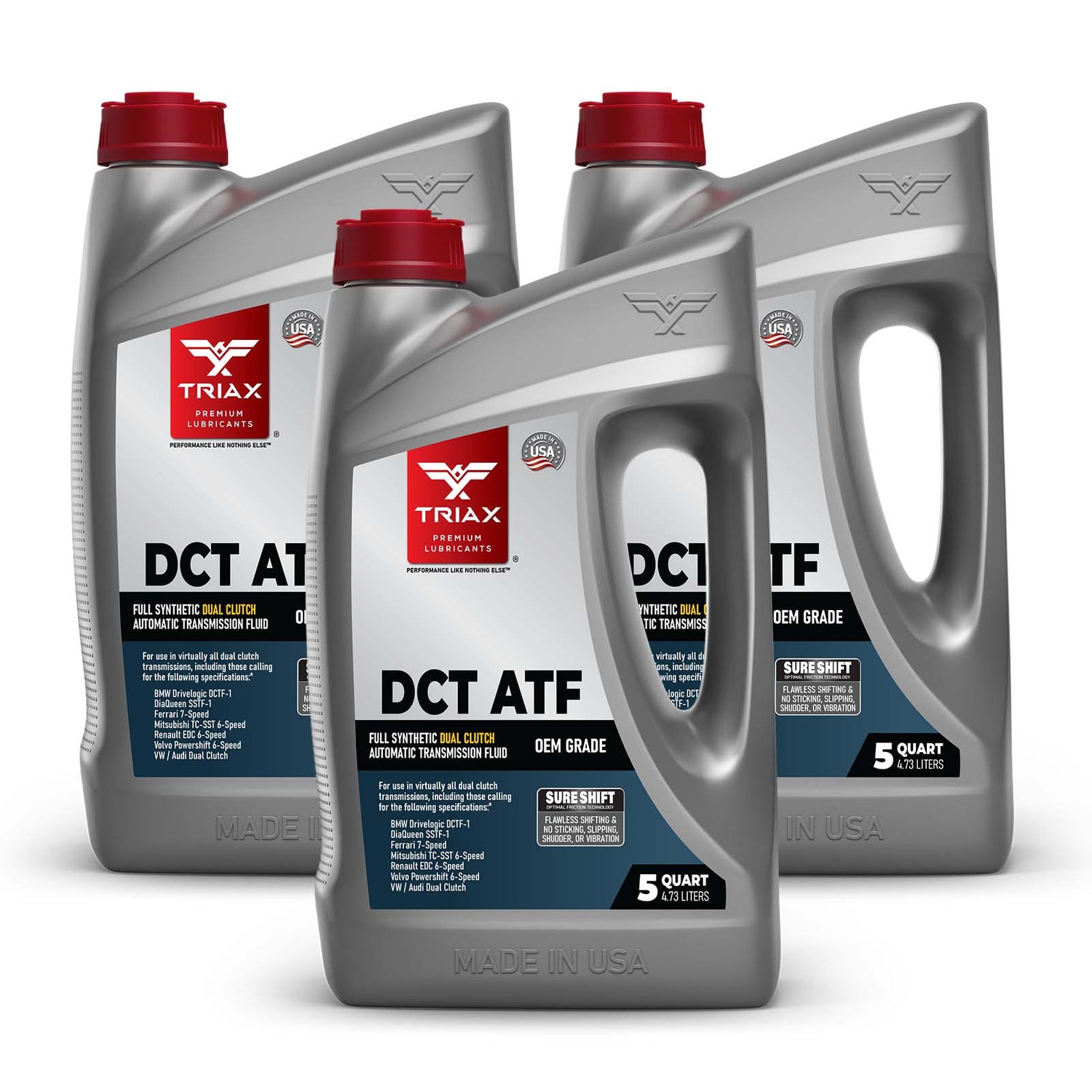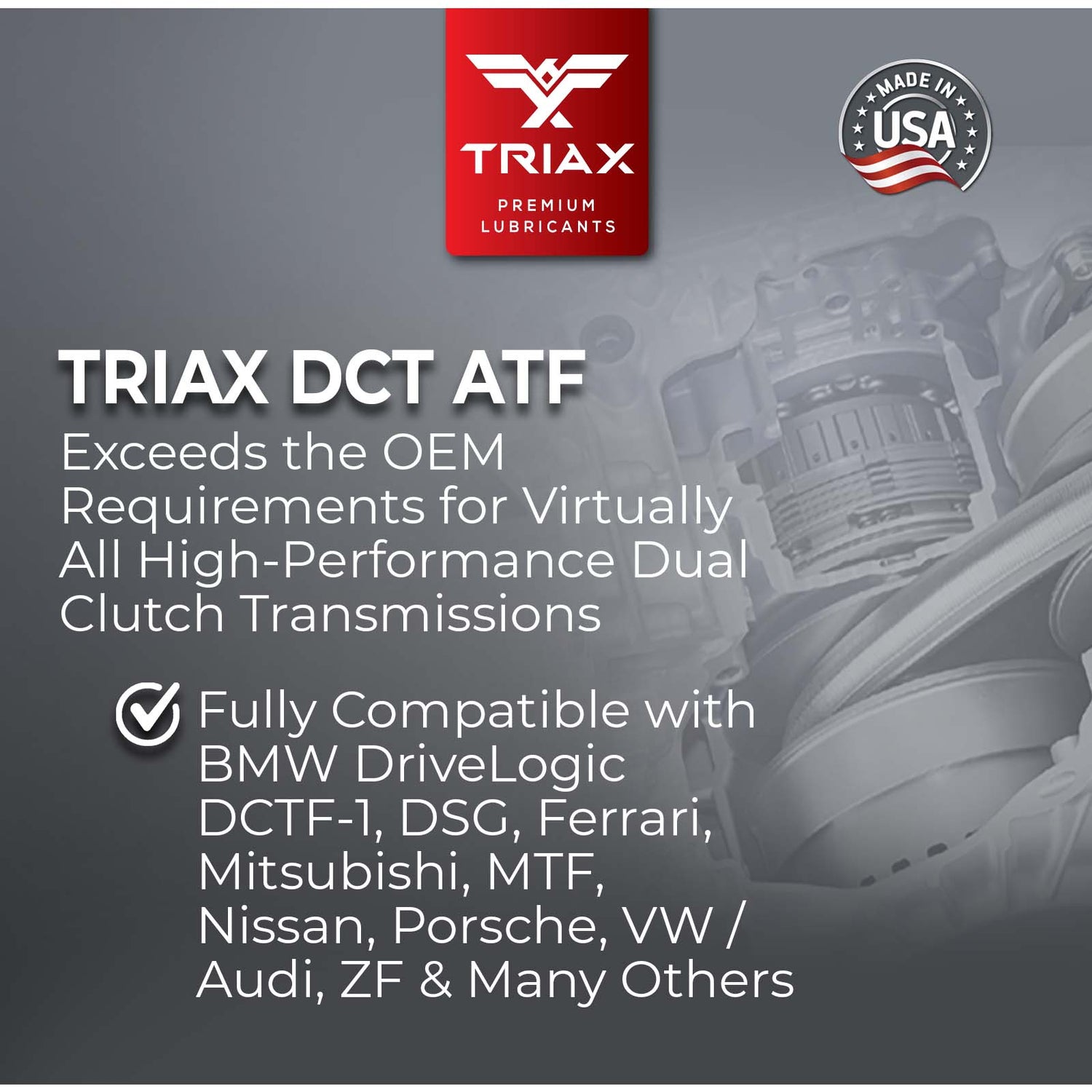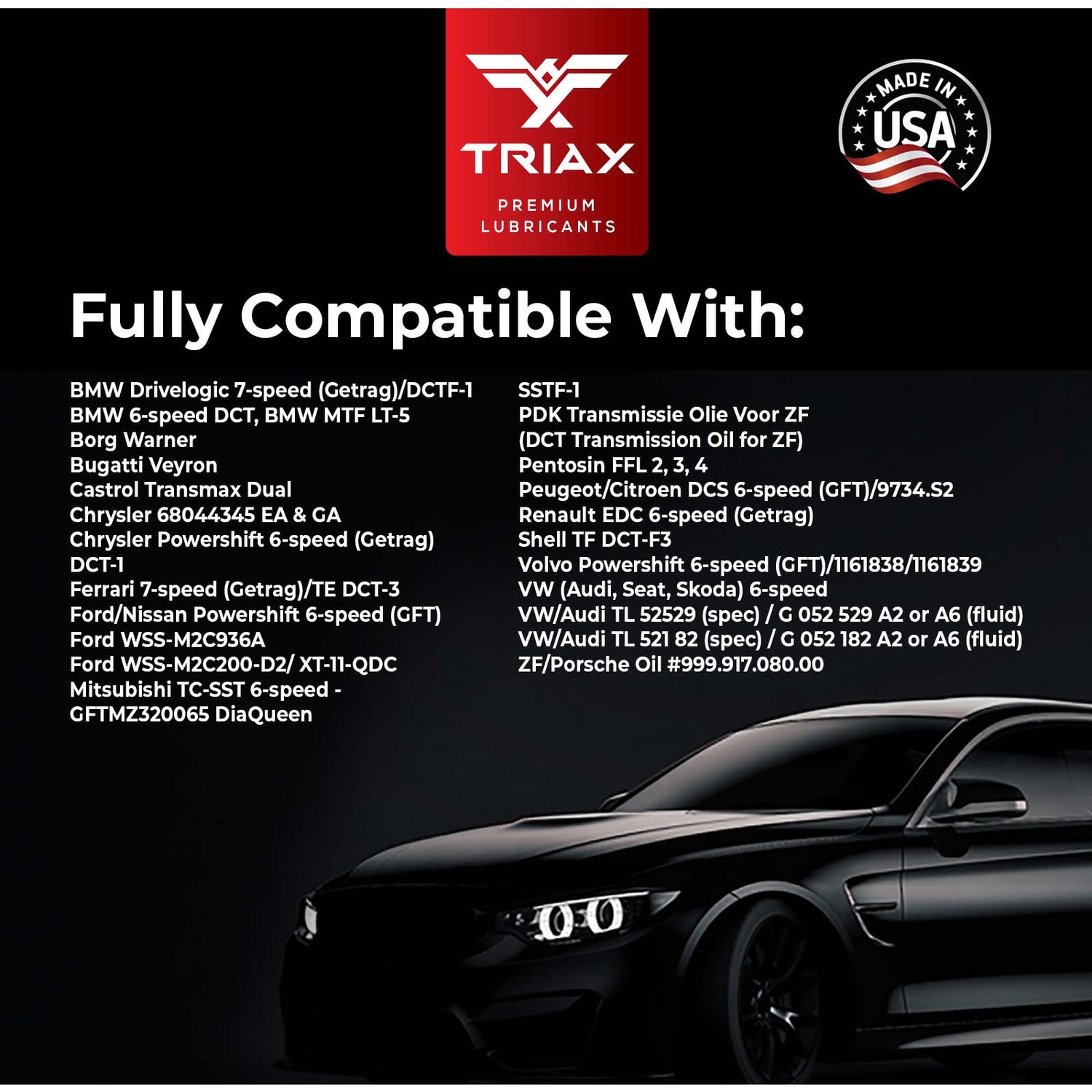 TRIAX DSG oferă o durabilitate excepțională și este compatibil cu toate cutiile de viteze cu dublu ambreiaj, inclusiv cele fabricate de BMW, Audi/VW, Mercedes-Benz, Peugeot, Porsche, Ferrari, Renault, Ford și ZF. Stabilitatea extrem de ridicată a frecării și caracteristicile excelente de aderență elimină alunecarea, previn zgârieturile angrenajelor și asigură compatibilitate totală cu toate garniturile și etanșările transmisiei.