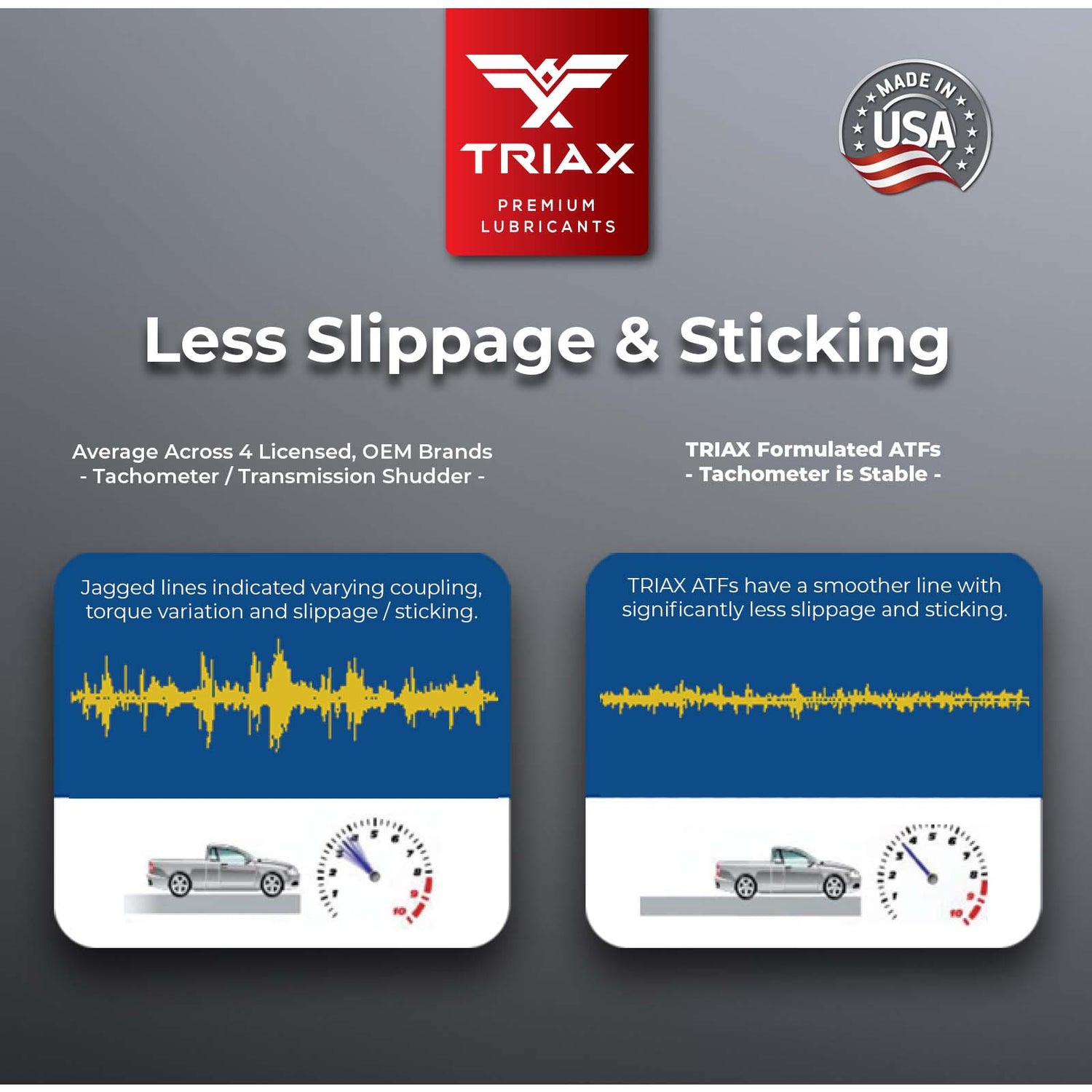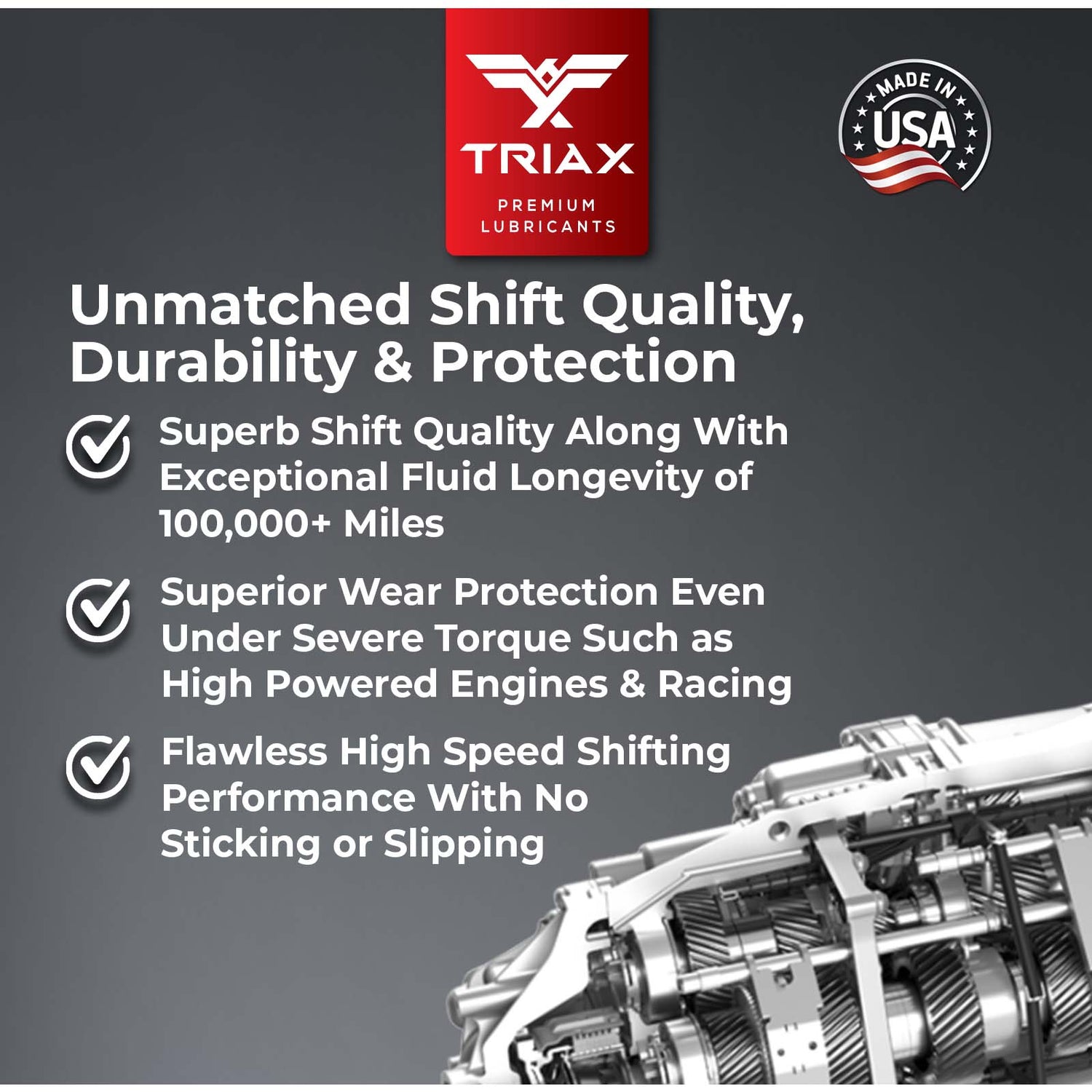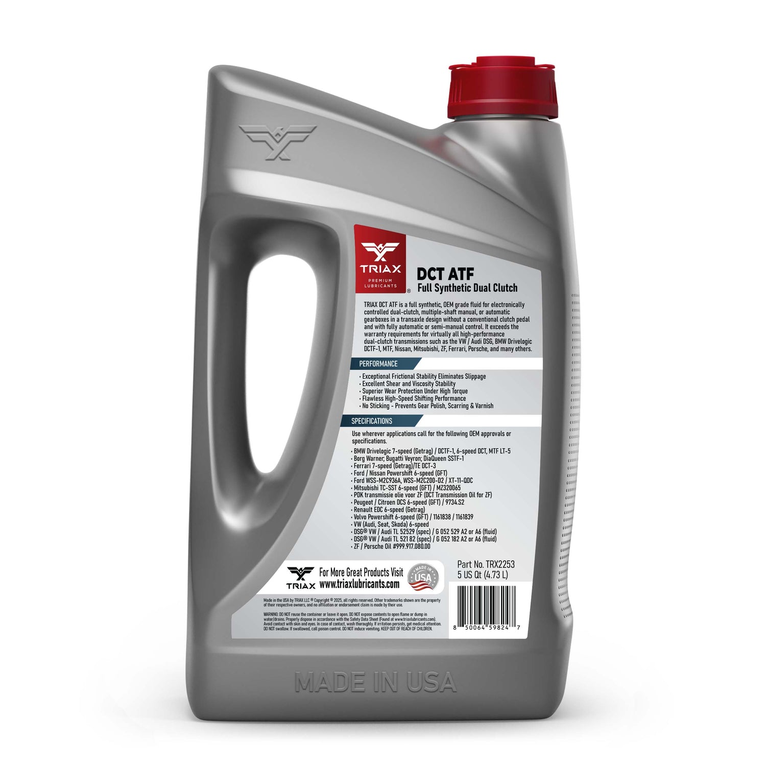 TRIAX DSG oferă o durabilitate excepțională și este compatibil cu toate cutiile de viteze cu dublu ambreiaj, inclusiv cele fabricate de BMW, Audi/VW, Mercedes-Benz, Peugeot, Porsche, Ferrari, Renault, Ford și ZF. Stabilitatea extrem de ridicată a frecării și caracteristicile excelente de aderență elimină alunecarea, previn zgârieturile angrenajelor și asigură compatibilitate totală cu toate garniturile și etanșările transmisiei.